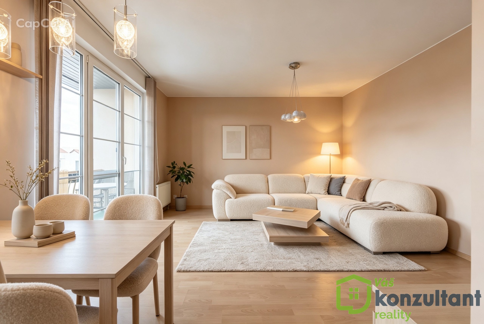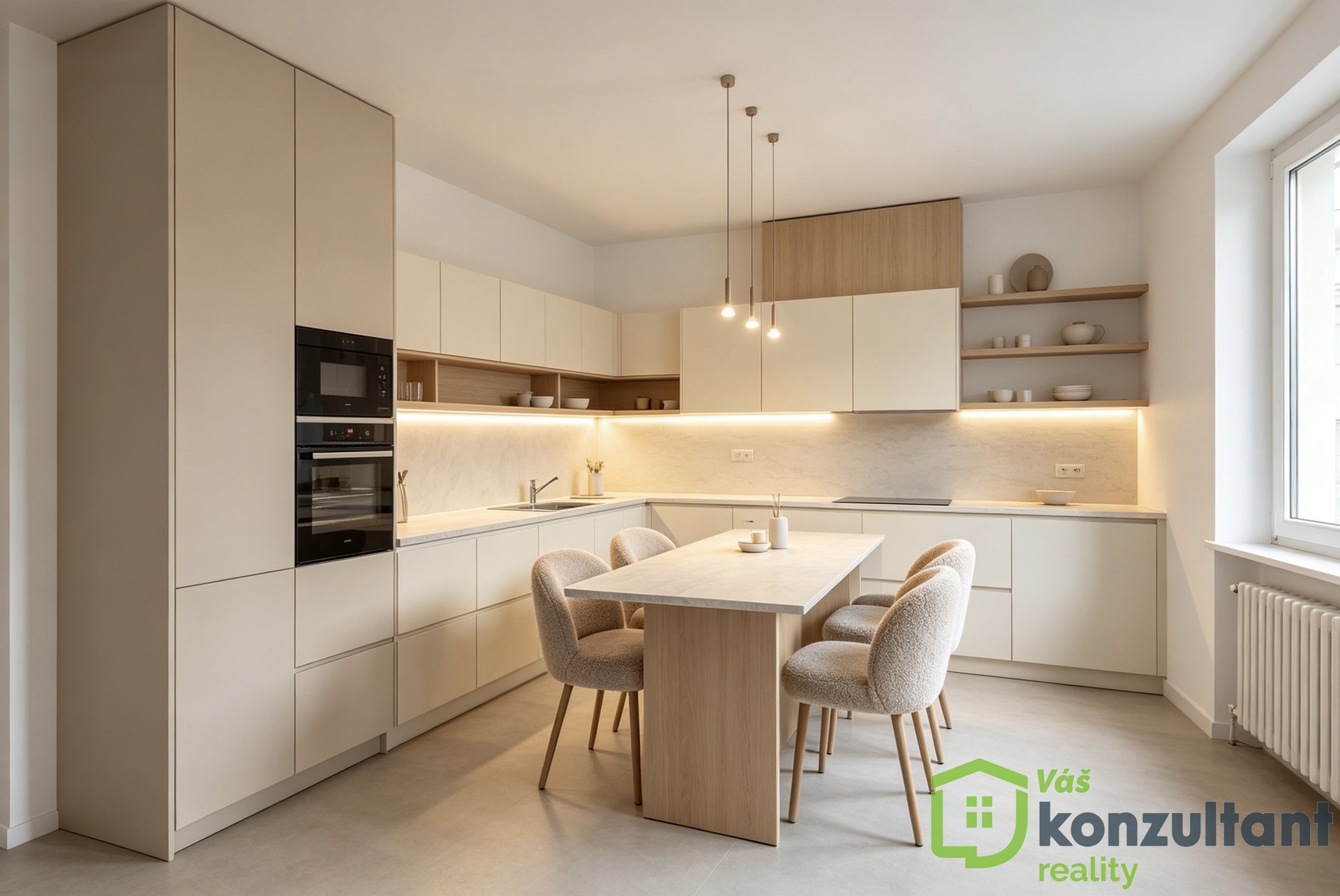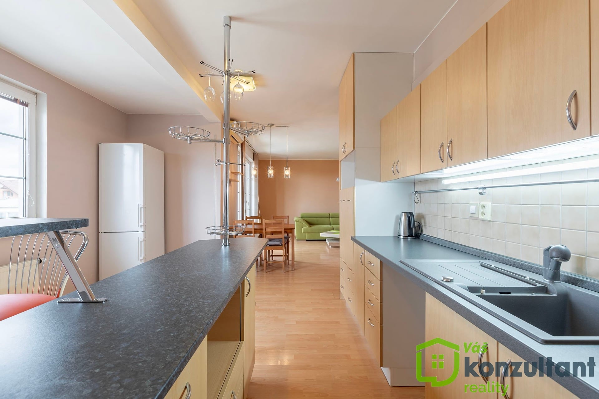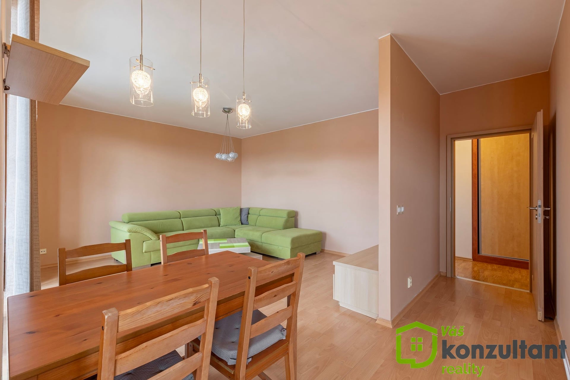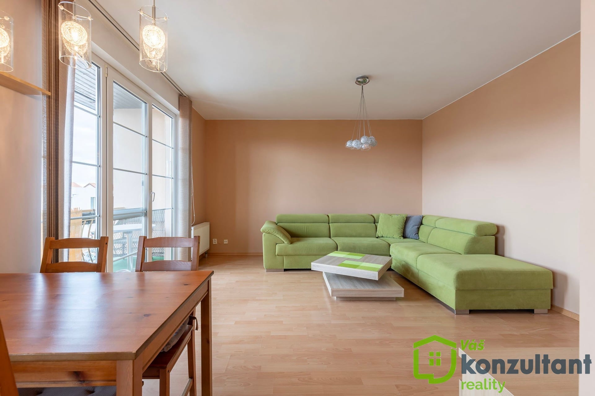 Samotný byt působí vzdušně a díky své velikosti nabízí pohodlné bydlení i pro rodinu. Dispozice je velmi praktická – dominantou je velkorysý obývací pokoj propojený s plně vybavenou kuchyňskou linkou. Tento prostor působí otevřeně a přirozeně navazuje na jídelní část i relaxační zónu. Z obývacího pokoje je vstup na lodžii, která nabízí nádherný výhled do okolní zeleně a je ideálním místem pro ranní kávu nebo večerní odpočinek v naprostém klidu.