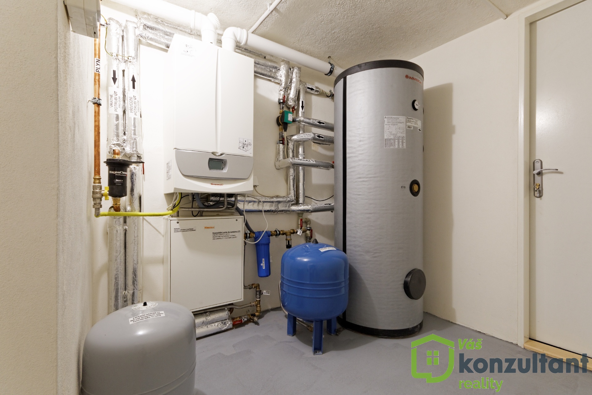 Topení a ohřev vody v bytě je zajištěno společným plynovým kotlem umístěným 1.PP domu.