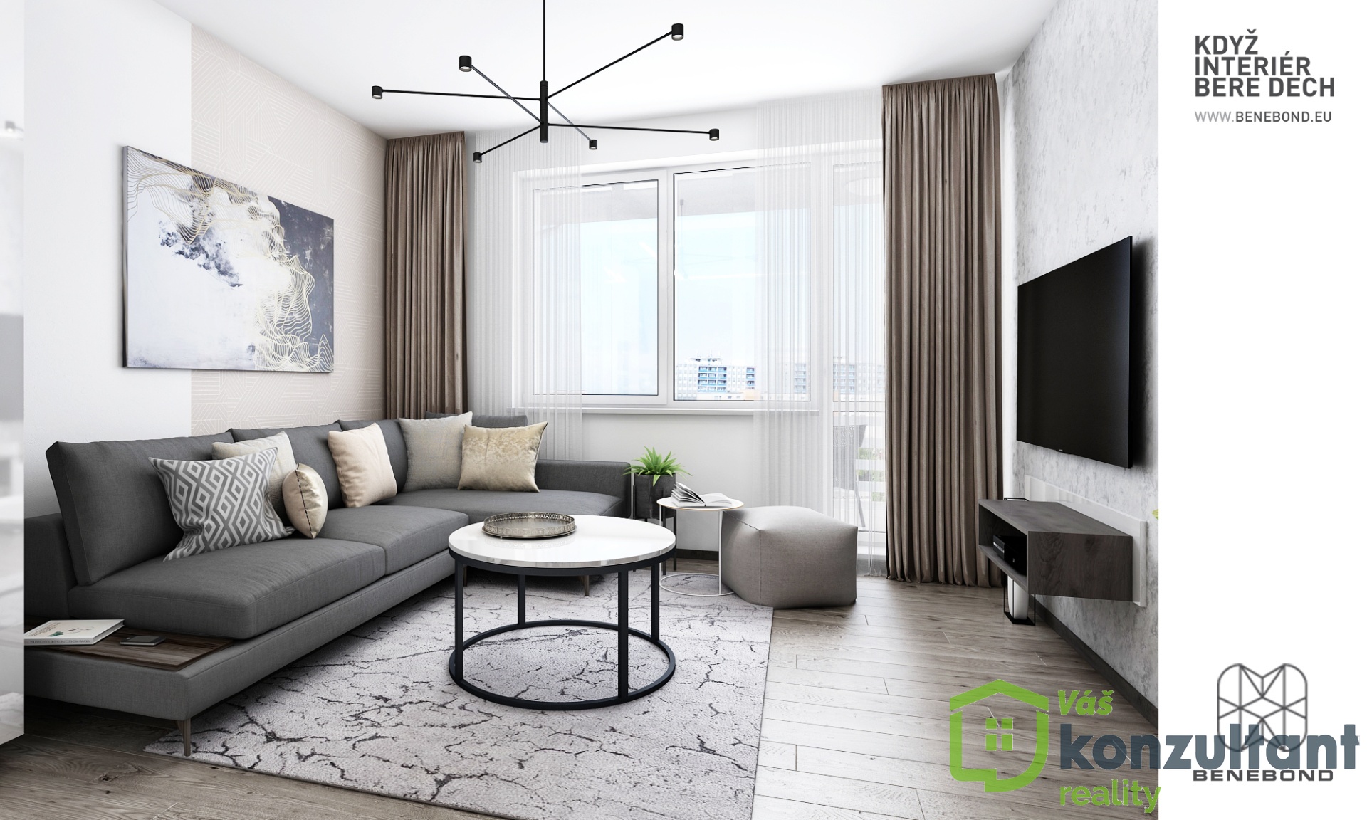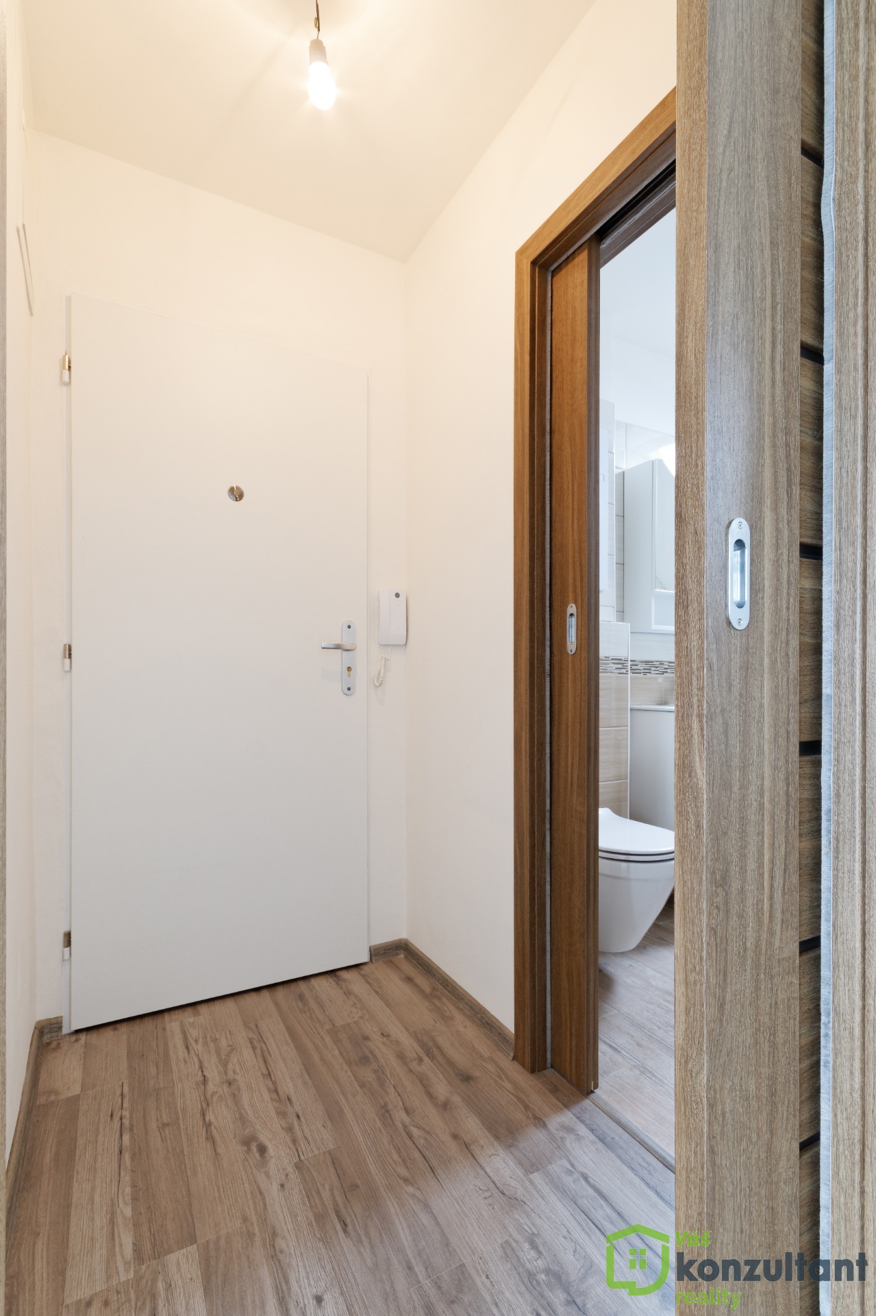 Po vstupu do bytu vejdeme do předsíně, po levé straně se nachází vstup do koupelny s vanou a toaletou. Z předsíně vejdeme do obývacího pokoje s kuchyňským koutem(24 m2) vstupem na terasu(21m2) a do ložnice(9 m2) orientované na jih.