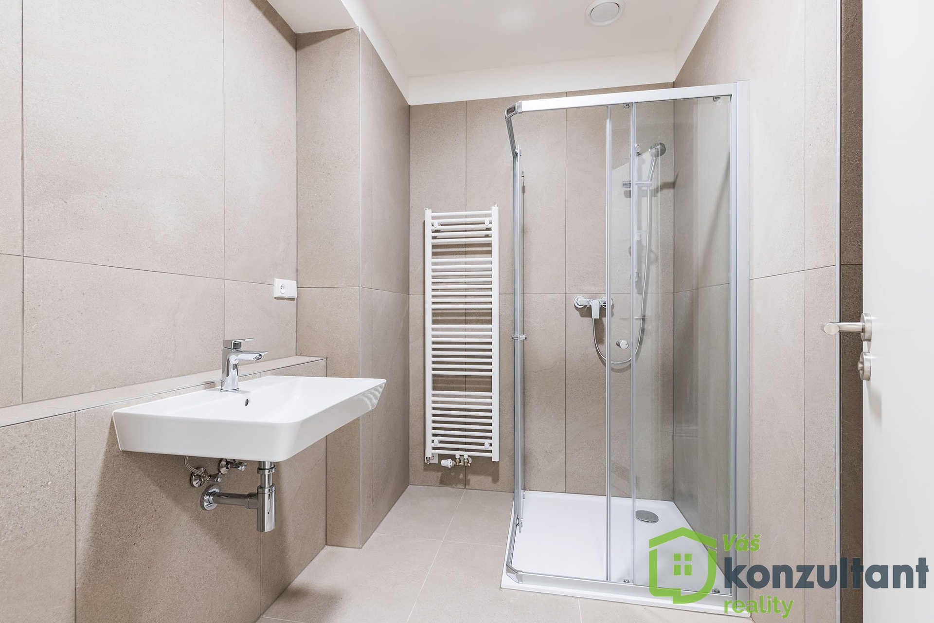 Koupelna je vybavena sprchovým koutem, umyvadlem, toaletou a pračkou.